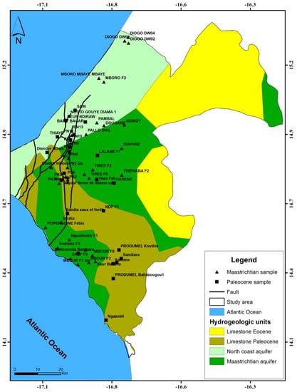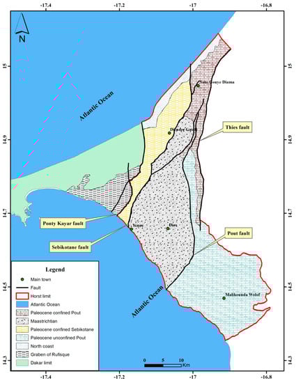 From a hydrogeological point of view, the study area includes two major aquifers, namely, the Maastrichtian and Paleocene aquifers, which play an important role in the water supply of households, industries, agriculture, market gardening, and mining. Due to major faults, the hydraulic system is configured into three compartments: 1/ the Sebikotane compartment at the West between the Ponty–Kayar and Sebikotane faults featured by the Paleocene limestone aquifer; 2/ the horst compartment at the center where the Maastrichtian sandstone aquifer is outcropped; 3/ the Pout compartment at the East where the Paleocene aquifer underlies the Maastrichtian sandstone aquifer. (Figure 2) [,,,,].