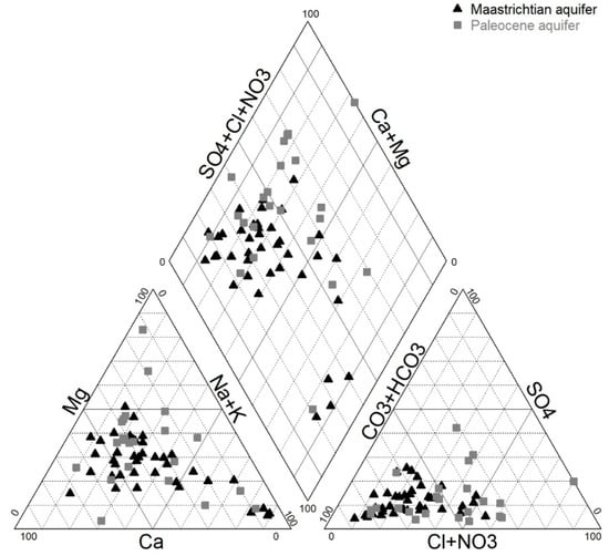 Chemical data (expressed in meq L−1) of the groundwater sampled in the two aquifers indicate a general order of magnitude as follows: HCO3− > Cl− > SO42− > NO3− for the anions and Na+ > Ca2+ > Mg2+ > K+ for the cations. Values plotted in the Piper trilinear diagram [] identified dominant HCO3-Ca-Mg water type in the Maastrichtian aquifer, while in the Paleocene aquifer, both HCO3-Ca-Mg and Cl-Ca-Mg water types occur (Figure 4).