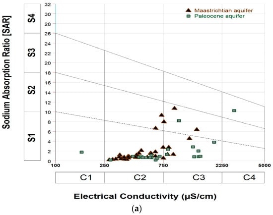 Groundwater salinity and SAR can be used to evaluate water quality for irrigation purposes. In general, the salinity in groundwater originates from salt leaching from soils, anthropogenic sources (e.g., fertilizer salts, waste water infiltration), weathering of the evaporate minerals, mixing of saline sources, or a combination of these processes [,,]. The SAR values of the Maastrichtian aquifer samples vary between 0.24 and 15.1 meq L−1 with a median of 1.38 meq L−1 (Table 4). For the Paleocene aquifer, the SAR values exhibit the same range as for Maastrichtian aquifer. Minimum and maximum SAR are 0.23 and 14.5 meq L−1 with a median of 1.27 meq L−1 (Table 4). As noticed, from Table 4, more than 90% of the sampled groundwaters from the two aquifers belong to class S1 and are therefore suitable for irrigation if only the SAR values are considered.