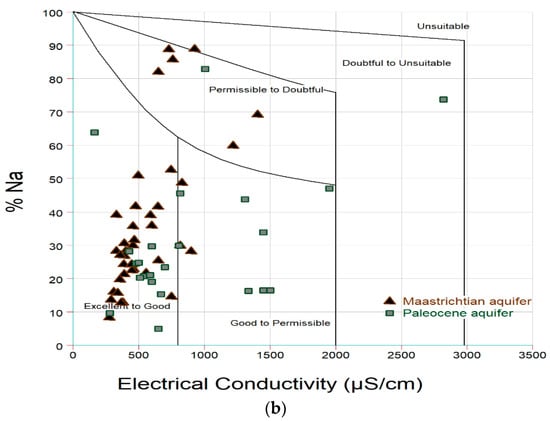 The Na% versus EC graph is also an important tool to evaluate the irrigation water suitability [,]. These two parameters plotted in Wilcox diagram (Figure 5b) are based on the Na%–EC relationship, where water quality can be distinguished into five classes: (i) excellent to good, (ii) good to permissible, (iii) permissible to doubtful, (iv) doubtful to unsuitable, and (iiv) unsuitable []. Figure 5 shows that 84.61% and 91.3% of the Maastrichtian and Palecene water samples are classified as excellent to good for irrigation purposes, respectively.