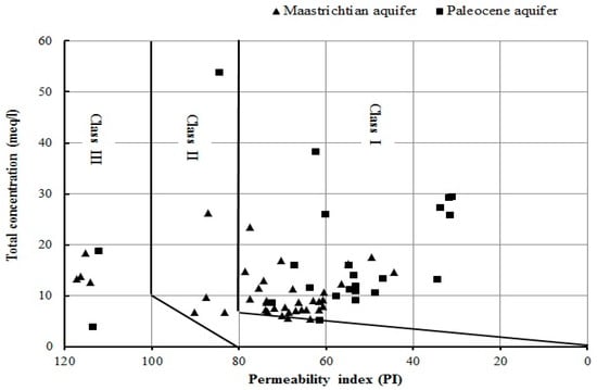 The permeability index (PI) of the Maastrichtian aquifer varies between 44.4 and 118%, with a mean of 73.77% and a median of 70.1%. As shown in Figure 6 and Table 6, 90% of the Maastrichtian sampled waters are suitable for irrigation according to PI and only 10.2% of the samples belong to class III. Among the suitable water, 79.5% belong to class I, 10.3% to class II. For the Paleocene aquifer, the PI ranges between 31.2 and 115% with a mean of 58.27% and median of 54.73%. Class I and class II represent up to 91.3% of the sampled waters (Figure 6).