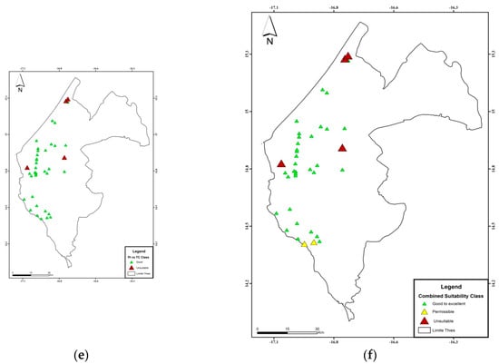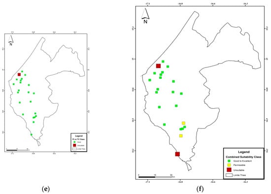 Water samples were classified by combining all the indices in order to determine an average water quality suitable for irrigation. Thus, the samples were grouped into three classes according to the water suitability for irrigation. Classes 1 and 2 include samples that are good to excellent (≥50% classified as suitable for indices) and permissible (25–50% classified as suitable for indices) for irrigation purposes, respectively. Class 3 was classified as unsuitable for irrigation, representing ≤25%. Based on this combined classification, most sampled Maastrichtian waters are considered as good to excellent (84.6%), especially from the region Pout North and Pout South; 5.1% as permissible class; and 10.8% as the unsuitable class. These latter samples are located around Diogo DW, Cheikh Mboup, and Diayane points (Figure 7 and Figure 8).