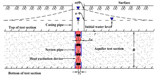 The theoretical model of the slug heat test is based on the thermal radial convection-dispersion theory, and the theoretical formula under the radial conditions without considering the heat transfer in the z-direction is established by the principle of heat conservation. The theoretical formula is solved by the Laplace transform and inverse transform, and the Stehfest algorithm and Talbot algorithm are selected to establish the standard curves of the theoretical model under different seepage and parameter conditions. The theoretical model of the slug heat test assumes the following conditions: (i) The aquifer is homogeneous and isotropic, with horizontal occurrence, constant thickness, and infinite distribution; (ii) The screen pipe is installed in the test section of the test well; (iii) The groundwater flow is radial, and convection-dispersion in the z-direction is not considered; (iv) The gap between the heat excitation device and the test well wall is ignored. The schematic diagram of the slug heat test model is shown in Figure 1.