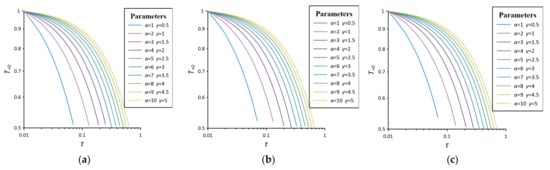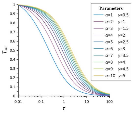 In the case of , according to Equation (33), where is taken in the range of 1 to 10, dimensionless time is taken in the range of 0.01 to 100, and is taken as 8. The Stehfest algorithm is chosen to establish a set of standard curves of dimensionless temperature variation with dimensionless time with respect to parameters in the case of , as shown in Figure 2.