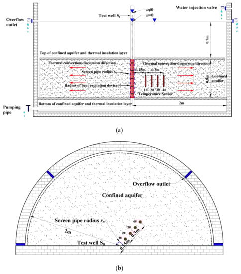 The system consists of three parts: model frame, confined aquifer system and observation system. Based on the consideration of saving space and satisfying the test conditions, according to the thermal radial convection-dispersion theory and the principle of axial symmetry, the test platform is designed as a semi-cylindrical sand tank as shown in Figure 4. The test well is set in the center of the semi-cylindrical section, and the overflow outlet is set on one side of the semi-cylindrical arc to ensure that the boundary is a constant water head boundary during the test, and observation points are arranged in the radial direction of the model to obtain water level and temperature data.