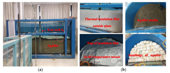 The model is a semi-cylindrical steel frame with a height of 2.2 m and a radius of 2 m. A semi-cylindrical test well with an inner radius of 4 cm is set at the center of the front of the platform, a support frame is set at the side and bottom, and a pumping pipe is set at the bottom. A glass transparent window is built on the front side for easy observation of the test process, as shown in Figure 5a. The test platform simulates a confined aquifer, with a thickness of 0.8 m and medium-fine sand with particle size of 0.25 mm to 0.50 mm. The top and bottom of the confined aquifer are covered with plastic film and thermal insulation film for waterproof and thermal insulation treatment. Sandbags are laid on the top to apply pressure, and groundwater is supplied from the side of the confined aquifer. The aquifer temperature observation device is mainly composed of test well S0 and pt100 type temperature sensors of , , and pre-buried in the aquifer at different distances from the test well, and the temperature data are monitored and uploaded to the computer terminal for data processing, as shown in Figure 5b. Four overflow outlets with a radius of 2 cm are set at a height of 1.5 m from the bottom of the confined aquifer to meet the requirements of constant water head. The physical picture of the test platform is shown in Figure 5.