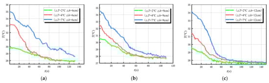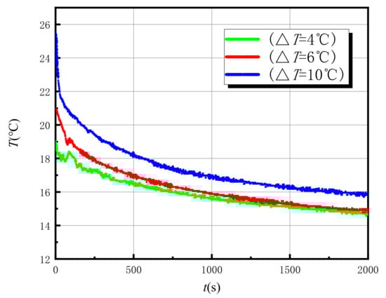In the case of u = 0, three different excitation strengths are used (the temperature difference is ), and two groups of parallel experiments are carried out for each excitation strength, with a total of six groups. The theoretical model of the slug heat test is used for calculation and analysis. The temperature variation curve of the test well with time for different excitation strengths in the case of is shown in Figure 6. It can be seen that with the increase of the excitation temperature, the peak value of the curve also increases, and the time range of large change amplitude of the temperature is between 0–2000 s.
