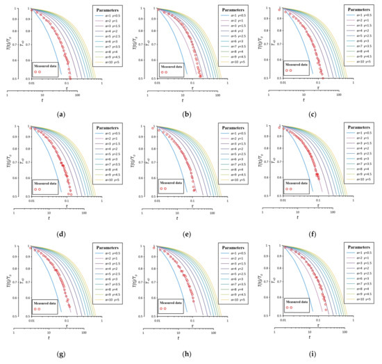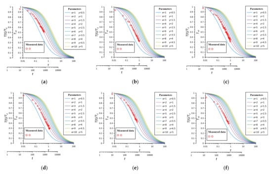 In the case of , according to Equation (49), where is taken in the range of 1 to 10, is taken in the range of −1 to 0 according to aquifer properties and seepage conditions, the dimensionless time is taken in the range of 0.01 to 1, and is taken as 16. The Tolbot algorithm is chosen to establish a set of dimensionless temperature variation , with dimensionless time with respect to parameters in the case of , as shown in Figure 3. According to the definition of the parameter, the corresponding flow rate increases as the parameter decreases, and the value has little effect on the curve shape and curvature in this test flow rate. Therefore, the standard curve of intermediate segment is chosen for data fitting.