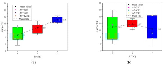 According to Figure 10a, when the water head difference increases from = 6 cm to = 12 cm, the flow rate also increases, and the average value of effective thermal conductivity of the aquifer increases from 9.3 W/(m) to 11.5 W/(m), indicating that the effective thermal conductivity of the aquifer also clearly increases with the increase of flow rate. At the same time, the thermal mechanical dispersion coefficient also increases with the increase of flow rate. As can be seen from Figure 10b, when the excitation temperature difference increases from = 2 to = 7, the average values of the effective thermal conductivity of the aquifer are 10.5, 10.9 and 10.2 W/(m), which are about 10.5 W/(m), indicating that the excitation temperature difference had little effect on the effective thermal conductivity of the aquifer. The errors of the test results mainly come from the accidental errors during the test operation and data acquisition. The effective thermal conductivity of the aquifer is mainly influenced by the flow rate in the aquifer.