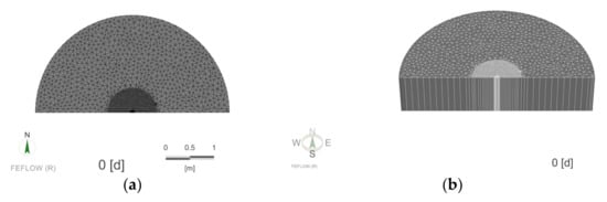 The FEFLOW finite element 3D model was used to create a numerical model according to the same dimensions and parameters as the indoor test platform. The model was set up as a confined aquifer of the same thickness as the indoor platform aquifer, and was divided in plane into the test well S0 area and the aquifer area. After establishing the model, the initial conditions, boundary conditions, and media properties of the model need to be assigned according to the parameters of the indoor platform, and the simulation problem type needs to be set. The initial conditions of this simulation are set to the excitation heat source with the same temperature as the indoor model test, and the problem is set to the heat transfer problem in the saturated medium. The arc side boundary of the test platform is equipped with an overflow outlet to keep the constant water head, so the arc side of the numerical model is set as the first type of constant water head and temperature boundary. The glass side of the semi-cylindrical section of the test platform is treated with water and heat insulation, so this boundary in the numerical model is set as the second type of zero flow and zero heat flux boundary. The top and bottom of the confined aquifer are set as the second type of zero-flow and zero-heat flux boundaries, respectively. Observation points were arranged in the test well to observe the temperature change of test section in the test well with time. Mesh generation and local encryption were performed on the simulation model and a 3D model was built, and the built numerical model is shown in Figure 11.