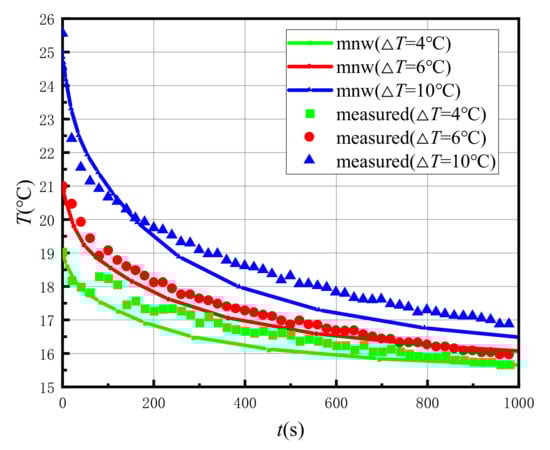 According to Table 6, the parameters of the numerical model in the case of were assigned. The numerical model was run and the temperature change of the test section in the test well was observed. The temperature change data obtained from the simulation were compared with the measured temperature change data of the indoor model test. The data during the time of 0 to 50 s with a large temperature change range were selected to observe the curve shape, as shown in Figure 13.