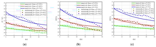 It can be seen from Figure 12 that the temperature change range for different excitation strengths (, ) in the case of is concentrated in the 0 to 1000 s time period, and the longer recovery time to the initial temperature is required as the higher excitation temperature. The temperature variation curves calculated in the numerical simulation and measured in the indoor model tests have similar shapes. The calculated and measured values have the same law and can be matched well, except that the calculated curve is smoother and the measured curve fluctuates relatively more; however, the variation laws and trends are completely consistent, and the error is mainly due to the accidental error in the process of test operation and data acquisition in the indoor test. This shows that the theoretical model of the slug heat test in the case of can accurately obtain the stagnant thermal conductivity of the aquifer and derive the thermal property parameters of the rock-soil skeleton, which verifies the accuracy and reliability of the theoretical model, calculation method and test method of the slug heat test.