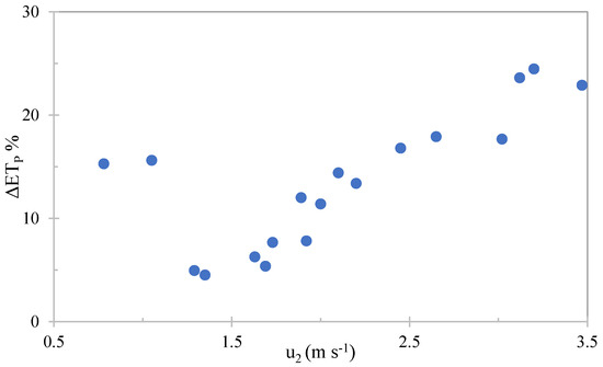 The deviation in ETP modeled based on PT and PM, averaged over four different scenarios, across a wide range of u2 during the growing season is depicted in Figure 2. It shows that the difference in ETP estimates increases linearly with an increase in u2 from 1.3 to 3.5 m s−1. The deviation of ETP estimates was less than 12.0% within the u2 range of 1.3–2.0 m s−1 implying a closer performance of PT to PM. Cristea, et al. [68] also stated that PT provides a more reliable fit when u2 is less than 2.0 m s−1. Nouri and Homaee [46] also concluded that deviation of u2 from the range of 1.5–2.5 m s−1 leads to a large error in estimating ETo under data scarcity. The ETP estimated by PT deviated from PM-estimated ETP by more than 15% in our studied regions with a growing season u2 greater than 2.45 and less than 1.0 m s−1. As expected, the largest deviation in ETP estimates was observed for the windy environments. For four surveyed windy sites that had a u2 above 3.0 m s−1 (Bijar, Aligodarz, Sahand and Ardebil), the difference between ETP estimates was larger than 19.0%. The modeling literature also warns against not taking u2 into consideration for application of crop models for high wind speed locations [45,46,69,70,71].