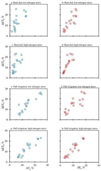 The deviation of evaporation (Ea) and transpiration (Ta) increased linearly with an increase in the deviation of PT-estimated ETP from PM-estimated ETP for all scenarios (Figure 3). The average deviations in transpiration and evaporation were 6.0% and 7.8%, respectively, under “rain-fed, low-nitrogen stress”, 4.8% and 5.6% under “rain-fed, high nitrogen stress”, 14.0% and 11.1% under “full irrigation, low nitrogen stress”, and 13.9% and 10.4% under “full irrigation, high nitrogen stress”. Given a smaller deviation for evaporation and transpiration for no-irrigation scenarios, PT was similar to PM in simulating evapotranspiration components under drier condition (Figure 3). Furthermore, the availability of nitrogen does not seem to contribute significantly to the deviation in the estimated evapotranspiration components. The difference for evapotranspiration components under rain-fed scenarios for the study sites was below 13% (Figure 3a–d). However, the difference between PT-simulated transpiration from the transpiration simulated based on PM was more than 20% under full irrigation scenarios for the four windy sites, i.e., Sahand, Ardebil, Aligodarz and Bijar with u2 above 3 m s−1 (Figure 3e,g). The evaporation results demonstrated a difference ranging from 12.8% to 19.2% for the sites with u2 values larger than 3 m s−1 for low water stress (full irrigation) scenarios (Figure 3f,h). It can be concluded that the difference between evapotranspiration components obtained by PT and PM is less under severe soil drought. However, PT may not be reliable for estimating the evapotranspiration components, particularly transpiration, for windy areas under full irrigation when u2 data are missing.
