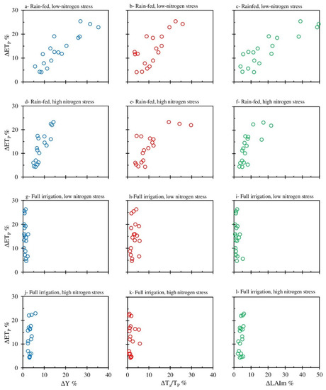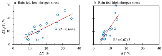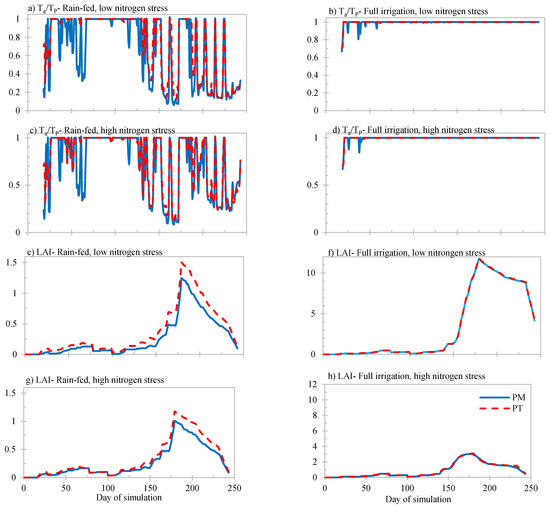 Under “rain-fed, low-nitrogen stress”, the difference between grain yield, Ta/TP and maximum LAI (LAIm) estimated by PM and PT increased linearly by increasing the difference in ETP estimates (Figure 4a–c). The difference exceeded 26.0% for yield, 16.0% for Ta/TP, and 38.0% for LAIm under “rain-fed, low-nitrogen stress” for the four windy sites with u2 above 3 m s−1 (Figure 4a–c). Considerable the difference between TP partitioned from PT-estimated ETP and that partitioned from PM-estimated ETP seems to arise from the large difference between LAI and ETP simulations (Equation (7)) for the windy sites under “rain-fed, low-nitrogen stress”. Thus, despite a relatively small difference between the transpiration estimates (13.0% >), PT-estimated TP deviated greatly from PM-estimated TP leading to a high difference in Ta/TP simulations under “rain-fed, low-nitrogen stress” (16.0% <). In other words, a high deviation of ETP estimates causes a large difference in TP (Equation (7)) and, consequently, in the water stress index (Equations (9) and (10)). Given that the correlation coefficient was greater than 0.65 (Figure 5), there exists a strong association between the difference of Ta/TP and the difference in yield under high water stress conditions. It is noteworthy that there is a direct association between Ta/TP and yield [62]. Consequently, a large difference in Ta/TP estimates resulted in a large difference in wheat yield for the sites that had a high wind speed and where soil water was highly restricted but with sufficient nitrogen. Liu, et al. [72] also reported that the application of different ETP approaches impacts the accuracy of yield simulations by affecting transpiration and potential transpiration results for water-stressed soils. PT-simulated daily LAI was substantially different from PM-simulated daily LAI for the “rain-fed, low-nitrogen stress” scenario leading to a relatively high difference in estimating Ta/TP based on PT and PM for the growing season that had a u2 of 3.50 m s−1 (Figure 6a,e). In this case, there was a 37.1% difference in the daily LAI and a 13.4% difference in the daily Ta/TP results.