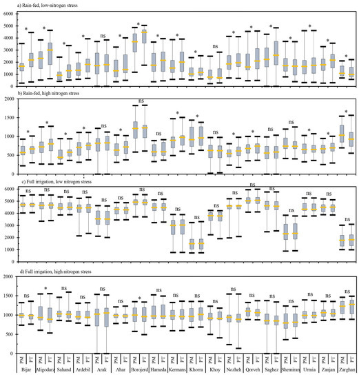 Figure 7. Distribution of crop yield (kg ha−1) simulated by applying the Priestley-Taylor/Ritchie (PT) and the Penman-Monteith DSSAT (PM) for four different management scenarios of all studied sites. The asterisks (*) indicate significant differences at the level of 95%. The “ns” indicates statistically insignificant differences. The boxes boundaries indicate the 25th and 75th percentiles, the lines within the boxes mark the median and the inner and outer fences represent the minimum and maximum values, respectively.