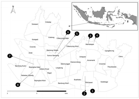 Study areas (urban villages) and subdistricts in Bandung City (Study areas are indicated by 1 to 8).