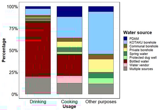Figure 3 shows the change of water sources in the current KOTAKU borehole users (n = 67), excluding four new households that moved into the area after water provision from the KOTAKU program. The previous main sources of the KOTAKU borehole users (n = 67) were private boreholes (40%), communal boreholes (19%), protected dug wells (10%), spring water (10%), multiple sources (10%), PDAM (6%), and vended water (3%). The reason for the shift from PDAM to KOTAKU (6%) was due to the intermittent supply by PDAM or to save money considering the cheaper tariff of the KOTAKU borehole. Seven households (10%) used the KOTAKU borehole as single source. Out of 67, 9 households (13%) shifted their drinking water source from bottled water (n = 2), vended water (n = 4), protected dug wells (n = 2), or spring water (n = 1) to KOTAKU boreholes. The number of households that shifted their cooking water source to KOTAKU boreholes was 26 (37%), which consisted of 4 that previously used bottled water, 6 vended water, 1 PDAM, 2 communal borehole, 2 private borehole, 4 protected dug well, 5 spring water, and 2 multiple sources (bottled water and communal borehole). The KOTAKU borehole replaced bottled water and vended water as drinking and or cooking water in 12 (18%) households, of which 6 households shifted for both drinking and cooking water. This implies that the KOTAKU boreholes are considered to be a reliable source by the households. All the 67 users shifted water sources for other purposes to KOTAKU boreholes, but 15 households (22%) were still using both KOTAKU boreholes and other free-of-charge sources, namely, private boreholes and protected dug wells (“Multiple Sources” in Figure 3).