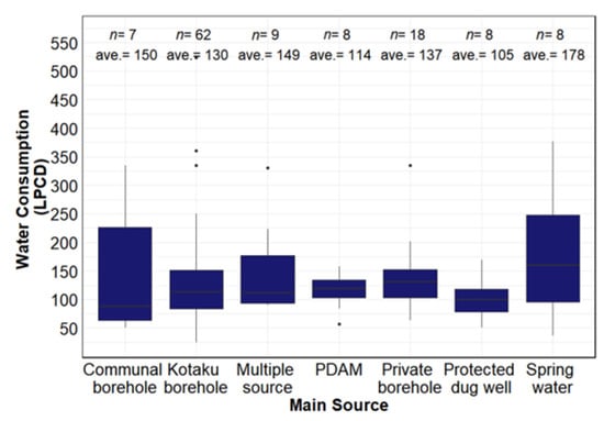 The average household water consumption was 134 LPCD. Figure 4 shows the consumption in the groups based on the household’s main source (most-used water source) with the number of samples and average consumption. There was no significant difference (Kruskal–Wallis, p > 0.05) in water consumption among the main water sources. The highest average consumption was observed in the spring water users (178 LPCD), while the lowest average was in the protected dug well users (105 LPCD). A total of seven (6%) households, namely, two communal borehole users (29% of the communal borehole users), two KOTAKU borehole users (3%), one PDAM user (12%), one spring water user (12%), and one protected dug well user (12%), consumed less than the target consumption (60 LPCD). The reason for the low consumption in the two KOTAKU borehole users was the low water availability or both low water availability and/or saving of water expenditure in the others according to the interview survey (see Section 3.4).