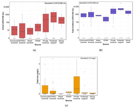 Water quality: (a) E. coli, (b) total coliform, and (c) total iron.