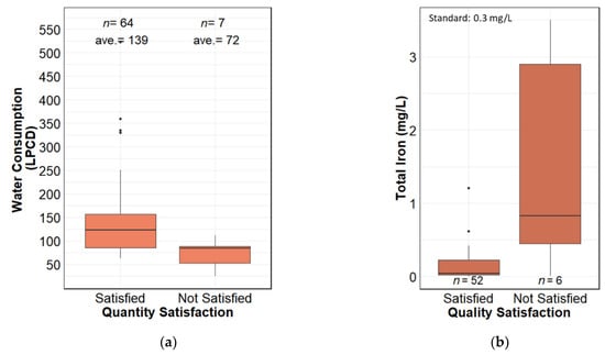 A total of 12 out of 71 KOTAKU borehole users were dissatisfied with the water supply from a KOTAKU borehole because of an inadequate quantity or quality (five households for each) or both of the reasons (two households). The two households that were dissatisfied with both quantity and quality were the users of multiple sources (KOTAKU borehole and private borehole or protected dug well) as their main sources. The seven KOTAKU borehole users with quantity dissatisfaction were supplied water for only 14 h or less in a week (Figure 7a), and their water consumption (average: 72 LPCD) was significantly lower than that of the other KOTAKU users (average: 139 LPCD) (Wilcoxon test, p < 0.05). As for the quality, the dissatisfied households disliked the physical appearance of the water as mentioned above. This can be explained by the fact that the total iron concentration of the six KOTAKU borehole users with dissatisfaction was significantly higher than the other 52 KOTAKU users, as shown in Figure 7b.
