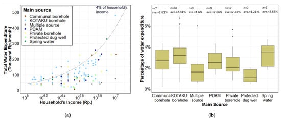 The data of household income and water expenditure were obtained from 113 out of 120 households. The income in half of the households was lower than the minimum wage (IDR 3,742,276) of Bandung City []. Figure 8a shows the monthly average household income and total water expenditure, including expenditure for bottled water and vended water. It is reported that less than four percent of the income was affordable water expenditure []. There were 20 households (17%) that spent more than 4% of their income on water: 12 KOTAKU borehole users (20% of the total KOTAKU borehole users), 2 private borehole users (12%), 2 communal borehole users (29%), 2 spring water users (20%), 1 PDAM user (13%), and 1 multiple-source user (11%). Among the 20 households, 6 KOTAKU borehole users and 1 spring water user pay a flat tariff (low tariff).