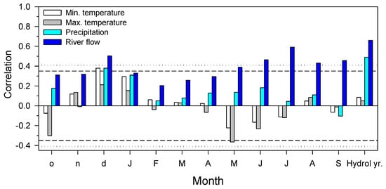 Pearson correlations calculated by relating ash ring-width indices (period 1970–2018), monthly climate variables (mean minimum and maximum temperatures, precipitation) and river flow. Dashed and dotted horizontal lines indicate the 0.05 and 0.01 significance levels, respectively. Months of the prior and current years are abbreviated by lowercase and uppercase letters, respectively. The last bars correspond to the hydrological year.