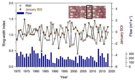 Neither the SOI (τ = 0.08, p = 0.42) nor the flow (τ = 0.17, p = 0.19) series presented any significant trend. The January SOI was negatively related to the ash growth series (r = −0.46, p = 0.001) and also to the river flow of the hydrological year (r = −0.30, p = 0.03; Figure 2). Consequently, the January SST3.4 was positively related to ash growth indices (r = 0.42, p < 0.01). Interestingly, the correlation between January SOI and river flow of the hydrological year increased in absolute terms (r = −0.37, p = 0.01) after excluding some of the strongest El Niño years in the observational record with January SOI values below the −1.5 threshold (1982/83, 1997/98 and 2015/16; cf. []). The correlation between SOI and ash ring-width indices remained significant after excluding these El Niño years (r = −0.35, p = 0.02). Comparatively, prior-October NAO showed lower correlations in absolute values with river flow (r = −0.30, p = 0.04) and ash growth (r = −0.32, p = 0.03).