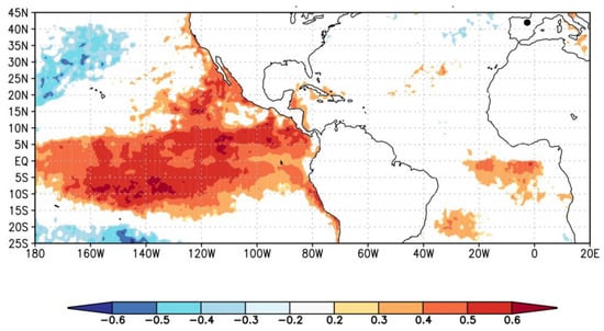 Other aspects of ENSO influences on European and Mediterranean rainfall patterns should be also considered. First, the relationships between the ENSO and European hydroclimate are non-stationary and they are modulated by the state of the Atlantic Ocean []. Second, there is a tendency towards more “Central Pacific” (CP, with predominantly positive SSTs in the tropical central Pacific) than regular “East Pacific” (EP) El Niño events in the recent decades, which may be linked with global warming and could lead to more frequent negative NAO phases and, paradoxically, colder European winters [,]. The tropospheric bridge linking the equatorial Pacific SSTs with the atmospheric circulation over Europe and the North Atlantic is more efficient in the case of CP El Niños. In fact, the presented spatial correlation (Figure 3) is coherent with the increasingly recognized role played by CP El Niño events. However, during the last few decades, EP events have been becoming less frequent but also very intense, which could also explain their importance as drivers of European hydroclimate []. The mentioned sources of non-stationarity impact European hydroclimate and Iberian rainfall and river flow patterns and should be considered in future research on the responses of riparian forests.
