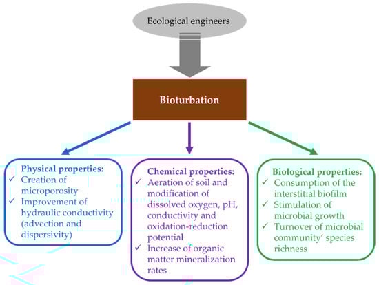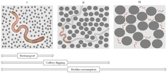 Microbial growth increases notable changes in the effective porosity, hydraulic conductivity and dispersivity [,,,]. Soil bioturbation is associated with the production of soil macropores as burrows or gallery networks that influence numerous physical properties of the substrate such as water infiltration []. Biostructures (burrow networks) dug in the soil column as well as in sediment create an additional porosity that changes the saturated hydraulic conductivity Ksat []. Relationships between total macropore properties and Ksat showed that the most important properties explaining Ksat were (i) the volume of percolating macropores, (ii) their diameter, (iii) the critical macropore diameter and (iv) the number of macropores []. This influence is quite relevant regarding the soil and sediment of the constructed filters as seminatural systems used for water treatments. Many types of filters are used for extensive devices as nature-inspired equipment that could be utilized on a sanitation site (individual scale) or in constructed wetlands, such as saturated or hybrid filters, aerated filters, etc. In water filters, the bulk hydraulic conductivity of the columns decreases by up to three orders of magnitude when the biofilm biomass reaches its maximum [,]. The addition of endogeic macrofauna in any of the treatment technologies based on water filtration could be an advantage for the filtration capacity of the filters (Figure 5). The continuous digging of burrow networks by earthworms is the most studied effect since these invertebrates are now well-recognized as ecological engineers [,,,]. The diversity of the species in the three functional groups of anecic, endogeic and epigeic reveals a range of solutions for improving the porosity in the entire soil column of the filters. The exploration of the optimal combination of worm species is still a research topic that would require further investigations.