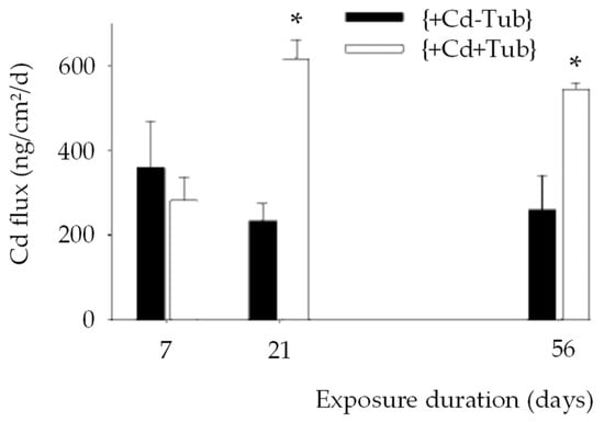 Estimated mean Cd fluxes from the water column to the sediment compartment of experimental units for the two experimental conditions: +Cd-Tub, water column contaminated with Cd and no Tubificidae in the sediment; +Cd+Tub, water column contaminated with Cd and Tubificidae in the sediment, over a period of time equal to 7, 21 and 56 d. Mean ± standard deviation (n = 3). * indicates a significant difference between the two experimental conditions (p < 0.05) [].