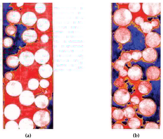 Examples of reconstructed (X-ray Skyscan 1174 data) sectional slices for the entire length of the column obtained after 10 days at a flow rate of approximately: (a) Q = 0.07 mL·s−1; (b) Q = 0.5 mL·s−1 (a pseudocoloration has been applied to the images using ImageJ on the basis of the ceretec LUT and only for visualization purposes). The whitened parts correspond to the beads, the red parts to the biofilm and the dark blue parts to the aqueous phase [].