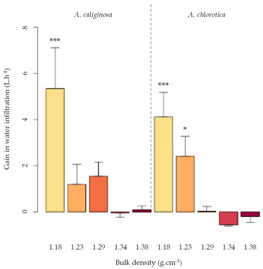 Gain in water infiltration (means + standard error) compared to control without earthworms when three individuals of either Aporrectodea caliginosa or Allolobophora chlorotica endogeic lumbriculids were incubated for 6 weeks in soil cores with increasing bulk densities. Stars indicate values significantly different from zero (each species was tested separately) [].