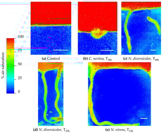 Examples of oxygen distribution in sediments. The gray-scale images were converted into false color. (a) Control without organism (resolution: 570 × 570 µm); (b) Cyclope neritea (resolution: 610 × 610 µm); (c) Nereis diversicolor (resolution: 500 × 500 µm); (d) N. diversicolor (resolution: 790 × 790 µm); (e) Nereis virens (resolution: 770 × 770 µm). Times at which the pictures were acquired are indicated [].