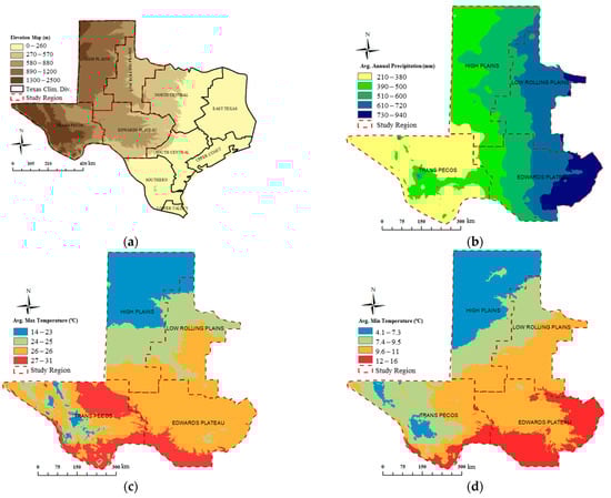 (a) Texas elevation map and its climate divisions; (b) mean annual precipitation; (c) mean annual maximum temperature; and (d) mean annual minimum temperature.