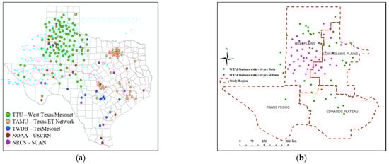 Data from West Texas Mesonet (WTM) [25] was utilized in this work among several weather networks currently in operation across Texas, shown in Figure 2a WTM, established in 1999, delivers accurate climatic and agricultural datasets to people of the West Texas for free in a timely fashion [25]. WTM is a joint partnership between the Atmospheric Science Group and Wind Science and Engineering Research Center at Texas Tech University, Lubbock, Texas. As of January 2017, WTM consists of 88 automated surface meteorological stations (Figure 2a). WTM site elevations ranged from 397 to 1348 m above mean sea level; corresponding longitudes and latitudes vary from 99°17′27.6″ W to 103°21′28.8″ W and from 30°28′48″ N to 35°55′4.8″ N, respectively. In this study, we only used data from 48 stations that have daily climate data for ten years (1 January 2007–31 December 2016) (Figure 2b in pink).