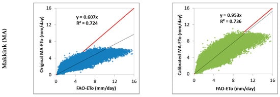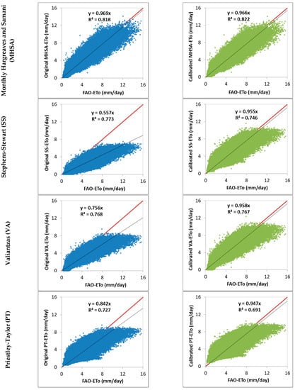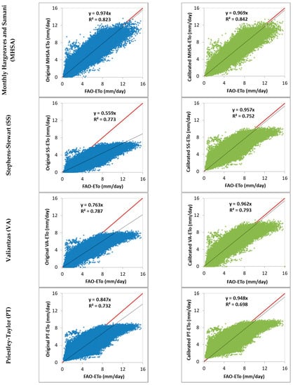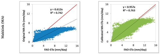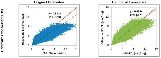 The performance of all empirical equations using the original and calibrated parameters is evaluated in comparison with the FAO-PM ETo using WTM and PRISM datasets. Figure 3 illustrates the relationship between predicted ETo from the empirical equations and the standard FAO-PM method based on data from WTM. The departure from the straight line 1:1 in all the selected equations (R2 ranged from 0.727 to 0.818 and regression coefficient ranged from 0.557 to 0.969) confirmed the unsatisfactory performance and marked tendency to underestimate ETo. This underestimation concurs with previous studies carried out in other regions [29,30,31].