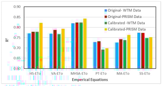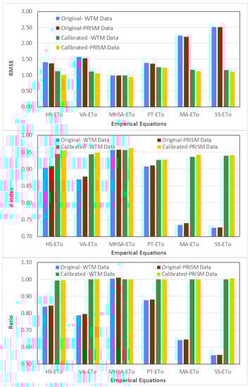 All methods underestimated ETo when original parameters were used (R2 ranged from 0.732 to 0.823 and regression coefficient of 0.559 to 0.974); however, ETo estimation of all methods substantially improved (R2 ranged from 0.698 to 0.842 and regression coefficient of 0.948 to 0.969) when the values of the calibrated parameters are used. MHSA had the best performance; however, all methods underestimated ETo values in the range of 8–16 mm. Statistical indices (R2, RMSE, d index, and Ratio) used to assess the performance of ETo estimates using original and calibrated empirical equations with WTM and PRISM datasets are depicted in Figure 5. According to these results, MHSA with calibrated parameters has the best performance using PRISM (R2 of 0.842, RMSE of 0.941, d index of 0.961, and Ratio of 1.005) than WTM datasets (R2 of 0.823, RMSE of 0.987, d index of 0.957 and Ratio of 1.0). Also, MHSA has superior performance compared to other models with uncalibrated parameters using WTM and PRISM datasets. The MHSA equation was derived by calibrating the HS equation monthly for the same region using weather data from 2005 to 2015 [15]. The calibration data used to generate calibrated parameters for MHSA included one year more data than that used in the uncalibrated equation. This explains the similar performance of MHSA using the default and calibrated parameters. One might conclude that the performance of the empirical equations improved using the values of fitting parameters generated based on the PRISM datasets compared to the default values (Figure 5). These findings concur with results reported on research conducted in Switzerland, West Australia [32], India [33], and China [34].