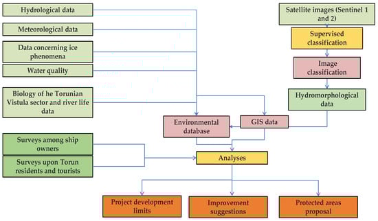 Considering the systematic and accurate arguments of all these previous studies, the scientific goal of our investigation is to present the main directions of an eco-study for a possibly challenging future IWT project: Torun and its Vistula stretch—an important spot for Green Navigation on a Blue Inland Waterway since we hypothesized that Torun would be an important spot/port on this ambitious IWT between two seas. In the eco-study that will substantiate this achievable and profitable project, specialists in environmental protection, remote sensing, GIS, hydrology, water management, and navigation management should cooperate. The results of this study could stimulate the beginning of a very ambitious and old enterprise for both countries, Poland and Romania: an inland waterway connecting the B-B seas. The study will prove if Torun (including its Vistula stretch) is a viable and profitable spot on this inland waterway, and its outcomes will constitute a baseline that can be used for the future project itself but also for many scientific, educational and economic purposes, businesses, programs, ventures, and strategies.