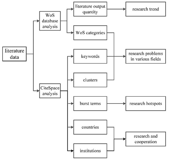 The literature data were analyzed by using the analytical function of the WoS database and CiteSpace to understand research trends, research hotspots, research questions from various fields, and cooperation between countries. The research methods are shown in Figure 1.