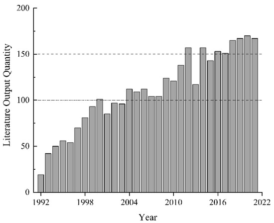 The data samples in this paper were retrieved from the WoS core collection database by topic terms. By taking preferential flow and its different forms as topic terms, papers and review papers published between 1992 and 2021 were retrieved. A total of 4187 papers were retrieved by “preferential flow”, 546 papers were retrieved by “macropore flow”, 496 papers were retrieved by “non-uniform flow”, and a small number of papers were retrieved by other topic terms, which did not affect the statistical analysis results and were therefore neglected. Meanwhile, the term of “preferential flow” is involved in many other fields. For example, in the field of materials science, the flow of liquids or gases in certain materials of special structures represents preferential flow of fluids. In the medical field, the flow of blood in certain organs represents preferential blood flow. In the field of network information science, there exists preferential flow of information. The “preferential flow” mentioned in this paper refers to fast water flow in soil. In order to eliminate the interference of literatures from other fields, the topic term of “soil” is added.
