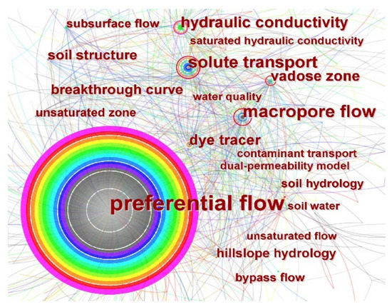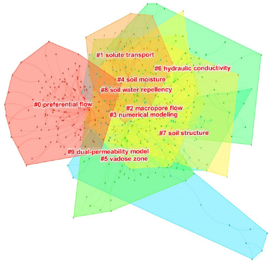 From Table 3, eight clusters were analyzed except two clusters whose names were used as search terms. The clusters of “soil moisture” and “vadose zone” refer to physical properties of soil and places where preferential flow occurs, respectively, both of which appear in many literatures and are generic terms. The clusters of “hydraulic conductivity” and “solute transport” represent the two categories of research on preferential flow—the law of water flow and the law of solute transport, which is consistent with the analysis results in Section 3.2. The clusters of “numerical modeling” and “dual-permeability model” represent a large number of research studies on computational methods and theoretical models, indicating that the development of computational methods and theoretical models promotes the research of preferential flow. The cluster of “soil water repellency” shows that many results of research on soil water repellency have been achieved. The cluster of “soil structure” represents the influence of soil structure on preferential flow, indicating that preferential flow is closely related to soil structure.