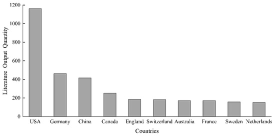 A statistical tool that comes with the WoS database was used to count the number of papers published by countries in the past 30 years, as shown in Figure 5. Figure 5 shows top 10 countries with the most publications on preferential flow from 1992 to 2021, among which the United States ranks first with 1163 published papers, accounting for 35% of the total, Germany and China rank second and third with 463 and 415 published papers, respectively, followed by the remaining countries, with about 200 published papers.