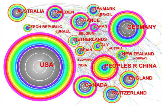 CiteSpace was used to draw a diagram of partnership network between countries, as shown in Figure 6. In the figure, each circle node represents a country, and the connections between nodes represent the partnerships between countries. The more connections from one node to another, the more cooperation it has with other countries. A node with a purple ring at its outermost layer indicates that the country at the node has a high betweenness centrality.