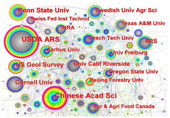 Figure 6 displays 94 network nodes and 459 connecting lines with a network density of 0.105. Analysis of Figure 5 and Figure 6 indicates that a number of countries in America, Europe, Asia, Oceania, and Africa have carried out research on preferential flow. The United States started early in preferential flow research since the phenomenon attracted the attention of the scientific community in the 1970s and has since achieved the most publications and a higher degree of success. Germany, Canada, the United Kingdom, Switzerland, Australia, France, Sweden, The Netherlands, Japan, and other countries also started early in preferential flow research and have attained a relatively large number of achievements. China started preferential flow research around 2000 and accelerated the research in recent years with the deepening of reform and opening up as well as global cooperation. Figure 6 shows that the pink rings on the nodes of countries with more publications are thick, indicating they have high betweenness centrality and cooperate more with other countries. From this, international cooperation is one of remarkable features of modern scientific research. Giving full play to the wisdom of scientists around the world and jointly overcoming difficulties will contribute to scientific progress and improvement in human survival and quality of life.