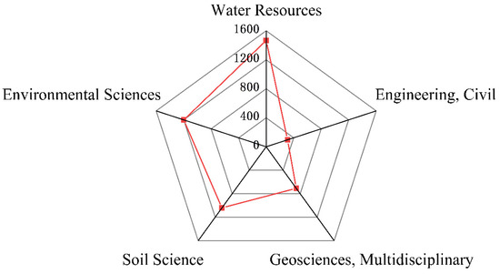 The analysis of the literature (published in the past 30 years) retrieved from the WoS database by using its own analysis function shows that preferential flow research is involved in many fields, among which the top five are water resources, environmental science, soil science, earth science, and civil engineering, as shown in Figure 8.