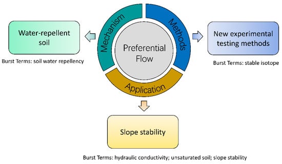 In the past 10 years, during which there has been a spike in publications on preferential flow, the top five disciplines with the most publications on preferential flow are still water resources, environmental science, soil science, earth science, and civil engineering. Preferential flow research is involved in these fields is closely related to human survival and development. From Table 3, “water balance”, “hillslope discharge”, “runoff generation”, and “hillslope hydrology” reflect that preferential flow research involves disciplines, such as water resources and earth science. In these disciplines, preferential flow poses a significant influence on runoff generation control and water regulation. “Contaminant transport” and “solute transport” reflect that researchers from environmental science have noticed that the waste carried by preferential water flow can result in extensive impacts on drinking water systems. “Cracking clay soil”, “soil properties”, “forest soil”, and “soil water repellency” reflect that the preferential flow research involves soil science. The researchers have noticed the inconsistent (positive/negative) role of preferential flow in soil science. Preferential flow can improve soil physicochemical properties and nutrient cycling in root zone, but it poses negative effects on water supply in root zone, which could prevent crop growth and decrease food production. From Table 5, the burst term of “slope stability” reflects that the preferential flow research involves civil engineering. The researchers from civil engineering have noticed that preferential flow pathways treated as conduits of subsurface water flow in the slope can prompt slope instability.