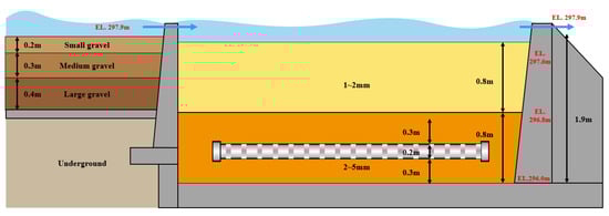 The open channel flow region was discretized as a virtual medium layer. In addition, the virtual medium layer was set as an unconfined aquifer, and the lower two layers were set as a confined/unconfined convertible layer. The thickness of the 2nd and 3rd layers, which are the sand filling layers, is 0.8 m, respectively, and for the hydraulic conductivity values of each layer, 172 m/d and 280 m/d, the values calculated through the indoor hydraulic test, are inputted, respectively. As shown in Figure 3, the specific yield of the 2nd (1–2 mm) and 3rd (2–5 mm) layers were entered as 0.45 and 0.39, respectively, considering the porosity, and the storage coefficient was entered as 1/100 of this value considering the sand layer. For the first floor, which is a hypothetical layer with 100% porosity, a storage coefficient value of 1.0 was input, and a hydraulic conductivity value of 50,000 m/d, which was calibrated through observed and simulated groundwater levels, was input. Only the inside of the sand dam was set as an active cell, and the outer part and the bottom of the 3rd floor were given a no-flux boundary condition. As the upper boundary condition of the simulation area, the amount overflowing from the existing pond and flowing into the sand dam was applied only to the active cell according to the location of the calculated water level. As internal boundary conditions, the weir of the 1st layer and the perforated drain pipe of the 3rd layer were simulated using a drain package. The drainage conductance was calculated through calibration of the model. The initial water level and head were entered as the first-floor bottom level for all floors.