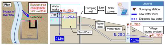 Figure 4 shows the cross-section of the sand dam environment. The water stored in the sand is first collected in an intake reservoir width of 1.5 m and a length of 3 m and then directly supplied to the water tank through a steel pipe. The water tank is on the downstream side of the sand dam, and the water could be piped with the help of gravity, but to make the water supply reliable, solar energy was also installed. Plan view of the sand dam and detail showing the connection between the old reservoir (pond) and the sand dam are shown in Figure 5. Figure 6 is schematic diagram of water supply system for the study area.