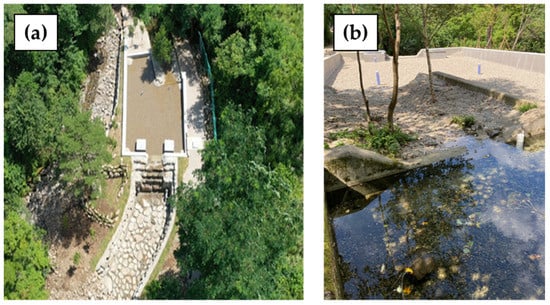 This study focuses on the application of sand dam technology in South Korea. A sand dam is usually built from concrete or beam on the impervious bedrock of a valley or river to accumulate sand materials and store water for later use [2,3,4,5]. Storing water in intermittent riverbeds has several advantages, including small-scale irrigation, water supply, and ecological use [6]. Even though sand dam technology has a long history, well-documented data on the worldwide application locations are unavailable [7,8,9]. Recently, the technology has attracted researchers’ attention, and several publications have been produced in the last three years [7]. Besides the working principles and success stories, the factors affecting the sand dam performance, future directions, and many more aspects are reported [3,4,7,10]. However, most of the studies, particularly the success stories, are in arid and semi-arid regions, e.g., [7,11,12,13].